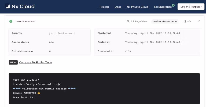 Until now, you had to have a task that is being executed through Nx Cloud. But what about those workspace utility scripts, like checking the commit format etc. You can now use nx-cloud record for those, like